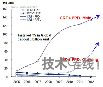從按照顯示元件劃分的替代需求來看,從CRT電視向其他電視的過渡成為最大增長因素。據推測,目前全球正在使用的電視數量約有30億臺。進入21世紀后,原來的模擬CRT電視開始以發達市場國家為中心向數字電視過渡。與此同時,出現了原來的CRT電視移至臥室,而將FPD電視擺放到客廳中的趨勢。雖然其中也包括從CRT電視向背投電視或內置調諧器的CRT電視過渡的事例,但這一部分在所有需求中所占比例較小,大部分是向FPD電視過渡的。
