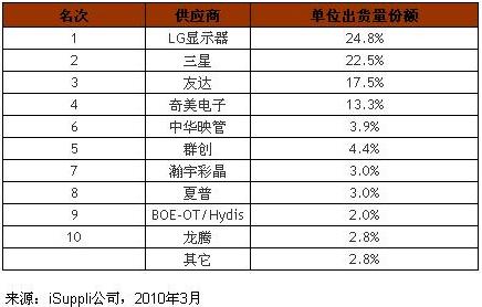 附表所示為iSuppli公司對(duì)1月份全球10大大尺寸液晶面板制造商的排名。根據(jù)iSuppli公司的定義,大尺寸液晶面板是指對(duì)角尺寸大于或等于10英寸的面板。