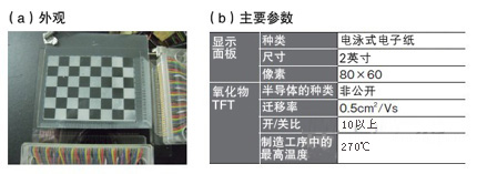 圖:采用凸版印刷的涂布型氧化物TFT的電子紙試制出采用可進(jìn)行涂布的氧化物半導(dǎo)體的TFT,成功驅(qū)動了電子墨水生產(chǎn)的電子紙(a)。特點是TFT的制造工序中最高溫度僅為270℃(b)。(圖:(a)由凸版印刷提供)