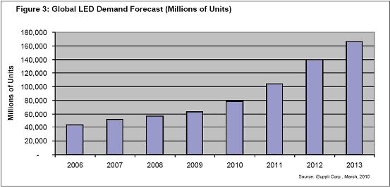 需求顯然超過了供給,而且LED市場至少在未來三年內(包括2010年在內)將保持兩位數的增長速度,iSuppli公司預測今年可能出現嚴重供應不足,除非增加額外產能來滿足日益增長的需求。