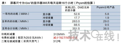 表1:屏幕尺寸為10m2的顯示器365天每天運轉(zhuǎn)16個小時(Prysm的估算)