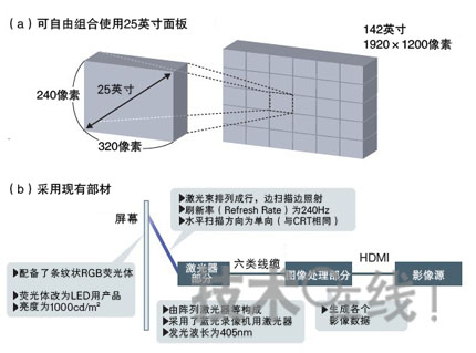 圖1:按照塊狀進行組成 Prysm計劃組合使用名為“Tile”的顯示器模塊來構(gòu)成大尺寸顯示器(a)。各個Tile的內(nèi)部均采用了對現(xiàn)有產(chǎn)品進行過革新的部材(b)。