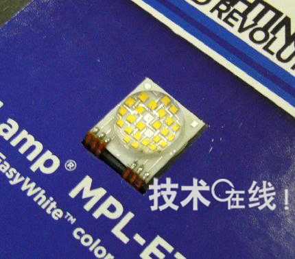 為了在較小的封裝尺寸條件下獲得較大的光通量,Cree降低了白色LED的熱電阻,并且封裝了24個藍色LED芯片。據介紹,新產品的熱電阻為3℃/W,而可得到數百lm光通量的其他公司白色LED則為6~10℃/W,相比之下新產品的熱電阻低了一半多。雖然降低熱電阻的方法沒有公布,但從封裝的外觀來看,似乎是采用了陶瓷底板的緣故。