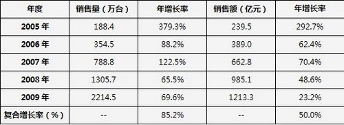 2010年4月13日,中國權(quán)威ICT研究與管理咨詢機構(gòu)賽迪顧問股份有限公司(股票代碼:HK8235)在“2010中國消費電子市場年會”上發(fā)布《2009-2010年中國平板電視市場研究年度報告》顯示:2009年,中國電視市場上,LCD電視已經(jīng)完成了對CRT電視的取代,LCD電視憑借產(chǎn)品性能的不斷升級和價格的不斷降低,在中國平板電視市場上占據(jù)主要地位,PDP依然在大尺寸平板電視市場固守陣地,但其市場份額被LCD不斷蠶食的局面已經(jīng)顯現(xiàn)。據(jù)賽迪顧問統(tǒng)計顯示,2009年中國市場共銷售平板電視2214.5萬臺,同比增長了69.6%,實現(xiàn)銷售收入1213.3億元人民幣,同比增長了23.2%。2005年-2009年中國平板電視銷售量復(fù)合增長率高達85.2%。