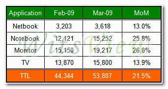 3月份從四大應用別出貨量來看,受到強勢出貨力道的帶動,以及春季機種上市的刺激。除小筆電面板之外,其它三大應用別均站上歷史出貨高峰,其中,電視面板出貨量為1,580萬片,月成長13.9%;液晶監(jiān)視器面板總出貨片數達到1,921萬片,MoM提升26.8%居本月之冠;12.1寸以上筆記本電腦面板出貨片數則為1,525萬片,增長25.8%。最后,12.1寸以下小筆電面板出貨361萬片,月增加13%。