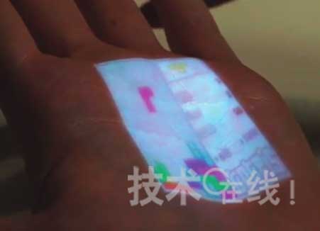 Skinput還將顯示器功能單獨分割出來。具體實現方法是,利用小型投影儀,將手掌及手臂作為顯示器使用(右上方的圖片)。