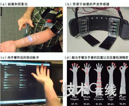 圖1:利用向手臂傳送的振動檢測位置卡內基梅隆大學等開發的系統的概要。系統由袖箍、計算機及投影儀構成(a)。袖箍內側安裝有聲波傳感器(b)。該傳感器可檢測敲擊手臂時的聲波脈沖(c)。根據敲擊位置的不同,位置檢測精度會略有波動。(攝影:Chris Harrison)