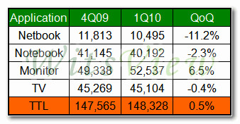 根據市場研究機構WitsView 的統計,2010年第一季全球大尺寸TFT-LCD面板整體出貨,延續去年第四季的成長動能,總出貨量增加至14,832萬片,不斷刷新面板歷史出貨高點,更創下連續五季正成長的紀錄。雖然出貨季成長僅0.5%,但和去年同期相比,亦有高達71.9%的傲人成長。