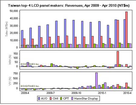 2009年4月至2010年4月,臺灣前四大液晶面板制造商營收狀況(圖表)