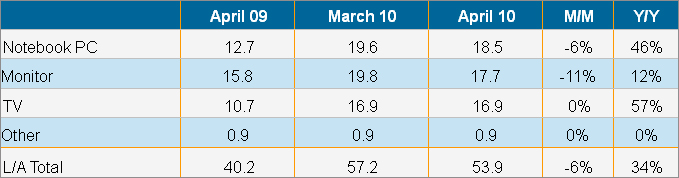 表一: 2010年3-4月大尺寸TFT LCD面板按應用出貨量(單位:百萬片)