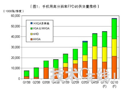在2008年開始的季度手機用FPD供貨量中,“iPhone”采用的“Half-VGA(HVGA)”(320×480像素)以上高分辨率的FPD供貨量見圖1。