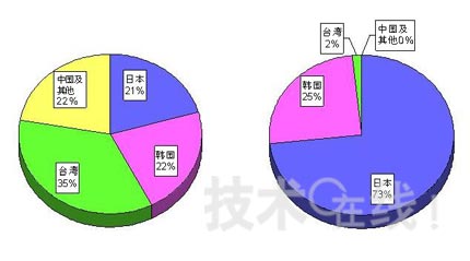日本液晶面板廠商正力圖在智能手機用高精細FPD市場上求生存。2009年手機用FPD總供貨量中不同國家和地區的市場份額,以及HVGA以上高精細手機用FPD供貨量中不同國家和地區的市場份額見圖2。
