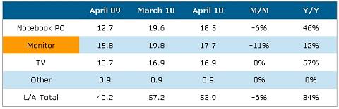 2010年3-4月大尺寸TFT LCD面板按應用出貨量(單位:百萬片)