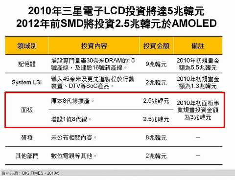 三星電子(Samsung Electronics)于2010年5月17日宣布激活總金額高達26兆韓元(約218億美元)的投資計劃,DIGITIMES Research資深分析師兼副主任黃銘章分析,該26兆韓元中,雖主要集中于內存部門資本支出、達9兆韓元,但在LCD投資亦高達5兆韓元,是其2009年LCD事業投資規模的6倍以上。