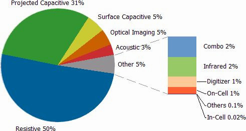 DisplaySearch指出,觸控面板市場變化多端,許多公司也從事不同技術的生產;所采用的觸控技術種類甚至超過十多種。不過電阻式觸控面板出貨量在2010年仍是主要應用的技術,目前約有90間公司仍然生產電阻式觸控面板。