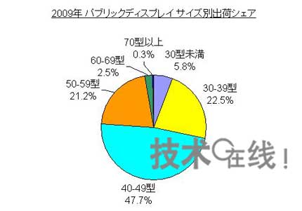 按供貨發送地來看,日本、北美和歐洲等發達國家地區占到總體的80%。特點是與其他IT產品和電視機相比,供貨過度傾向于人口集中、網絡等基礎設施完善的發達國家地區(圖2)。從不同尺寸的供貨份額來看,大于電視機平均尺寸的40英寸級產品占到整體的近一半。這是因為受到了作為標牌(廣告)的使用方法以不特定多數為對象,以及觀眾到畫面的距離大于普通電視收看環境的影響(圖3)。