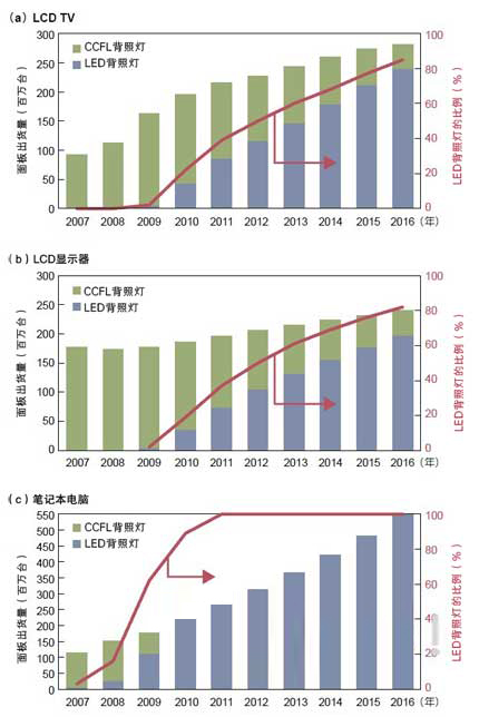 顯示器用的液晶面板與液晶電視面板一樣,從2009年下半年開始全面采用LED背照燈。但LCD顯示器市場對價格非常敏感,考慮到LED與CCFL背照燈的價差,許多觀點都認為顯示器市場的普及會遲于液晶電視市場。