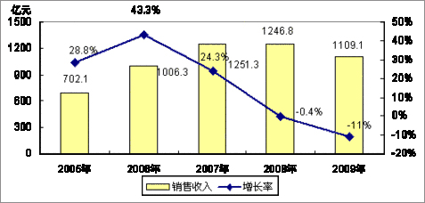 圖1 2005-2009年中國集成電路產業銷售收入規模及增長