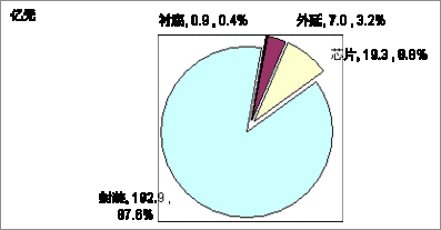 從產業結構上看,中國仍舊是封裝產業占據最大比重,2009年,封裝產業產值占到LED產業產值的87.6%。但隨著政府大力扶持上游外延、芯片產業的發展,一方面投資者看好LED市場發展潛力,對于外延、芯片環節的投資力度不斷提升。另一方面,現有外延、芯片生產企業也正在積極擴大產能。在新投資帶動以及企業擴產的帶動下,中國外延、芯片產業持續保持了較快的發展,在產業中所占比重也逐步提升。2009年,中國LED外延產業規模達到7億元,占整體產業的3.2%;芯片產業規模達到19.3億元,占整體產業的8.8%。而襯底產業則受限于技術等方面的原因,產業發展較為緩慢。