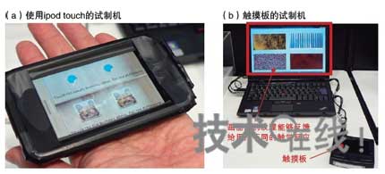 東芝信息系統采用配備了基于電場變化的觸覺反饋技術的iPod touch,觸碰畫面上顯示的按鈕區域,可以感覺到凸起(a)。在ESEC上還公開了觸摸板的試制品(b)。將指針與畫面內的紋理圖像合并,會感受到與其質感相應的觸覺。