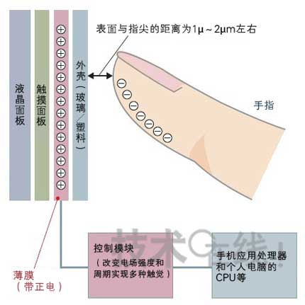 利用電場變化的方法的優點除了可以表現多種觸覺外,還包括由于無需機械部件,因此沒有振動音,不易損壞等。不用選擇可提示觸覺的場所也是其一個特點。在電子產品的側面、背面以及曲面上等原有技術難以實現的場所也可采用。另外,還可自由控制提供觸感的區域。例如,僅當用戶觸摸畫面上顯示的按鈕時,提供反饋觸覺等。