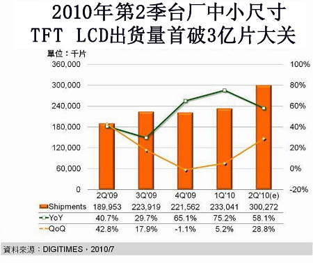 反觀大陸山寨機面板需求持續暢旺、大陸品牌手機市場亦逐漸成形、加上南韓雙雄三星電子(Samsung Electronics)及樂金電子(LG Electronics)積極導入AMOLED面板,并大量應用在其高階手機,因而加速用于中低階手機產品的a-Si TFT LCD面板半成品釋單臺廠,帶動臺廠2Q’10中小尺寸面板出貨量首度突破3億片大關。