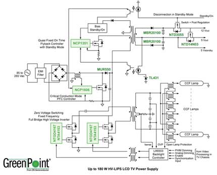 其中,在CCFL/EEFL背光的46英寸LIPS逆變器方面,所采用的安森美半導體NCP5111高端驅動器能夠提升能效及減小全橋500 V功率MOSFET的尺寸,且在修改高壓變壓器設計條件下,電路板上高度低于13 mm,從而支持低厚度設計。