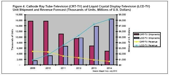 總體來看,CRT電視銷售額在2011年將降至16億美元,比2010年的23億美元減少32.3%。相比之下,液晶電視銷售額2011年將增長到35億美元,比2010年的18億美元大增94.3%。