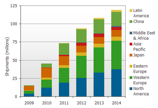 經過針對許多一線品牌2010年新產品線的調查分析,報告中指出,全球地區包含日本、北美、歐洲、中國和印度等地,已經有55%的電視機型擁有DLNA(數字生活網絡聯盟,Digital Living Network Alliance)的認證。整體而言, 聯網電視在2010年中預計將有4500萬臺的出貨量,約占有全年度所有電視出貨量的19%。DisplaySearch更進一步預測,預計到了2014年時聯網電視將會有約1億1900萬臺的出貨量,占有總出貨量的42%之多。