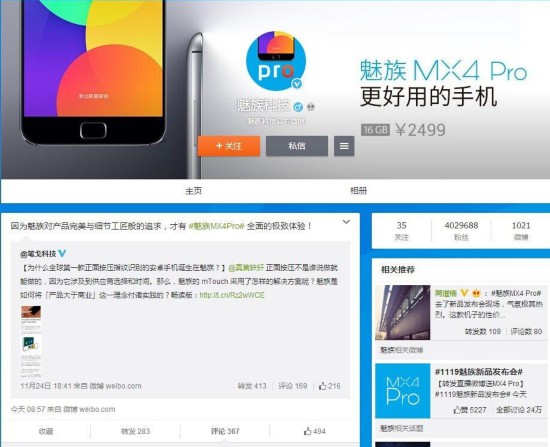 圖:筆戈科技發(fā)表長微博闡述成為首款正面按壓式指紋識別安卓機的緣由。