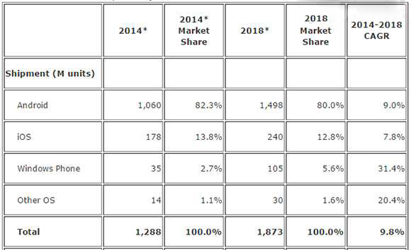 在 2018 年,IDC 預測安卓設(shè)備的銷量將會是 15 億(市場份額 80%),而 iOS 將會達到 2.4 億(份額為 12.8%)。而微軟的 Windows Phone 平臺則計劃屆時從 2014 年的 3500 萬臺銷量躍升到 2018 年的 1.05 億臺,在這 5 年間的 CAGR 將是 31.4%,安卓則為 9%,iOS 為 7.8%。