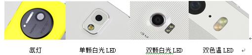 調查顯示,手機閃光燈主要有氙燈和LED閃光燈兩類,但氙燈因為結構復雜,體積大,難于集成,逐漸被LED閃光燈取而代之。LED憑著自身的光品質高、頻閃速度快、低功耗以及體積小、可作連續光源等諸多優點被大多數智能手機所采用,如Apple的iphone6、三星GalaxyS5、華為AscendP7、小米4等智能手機均配置了LED閃光燈,但是采用不同的LED設計方案。圖2中給出了市場上幾種典型的手機閃光燈方案。