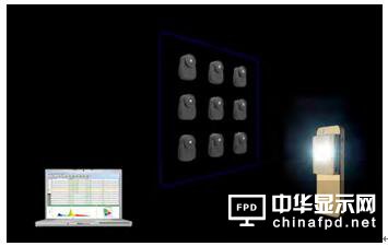 本文提出一種針對手機閃光燈測試的多通道快速光度與光譜相結合的測量方案:該方案集成了多個快速光度采樣模塊,采樣速度高達50ks/s,可實現各種閃光波形的快速準確測量;此外還設置光譜測量單元,以準確獲得閃光燈的光譜分布,進而分析閃光燈的色度參數。更重要的是,本方案中采用了光度與光譜相結合技術,將光度探頭和光譜測量結果相結合,并且相互校正,不僅避免了傳統光色度計的光譜失匹配問題,而且大幅提高了光譜測量的線性和測量范圍,獲得極高的精度,真正實現速度和精度的雙向需求。多通道還可以根據閃光燈的光形(如矩形或圓形)靈活布點,圖6所示為典型的矩形光分布測量點陣,配合專業的閃光分析軟件,可進行曝光量,閃光指數,閃光持續時間、色溫、顯色性、閃光以及顏色均勻性等各類參數的快速分析。
