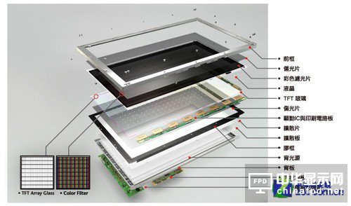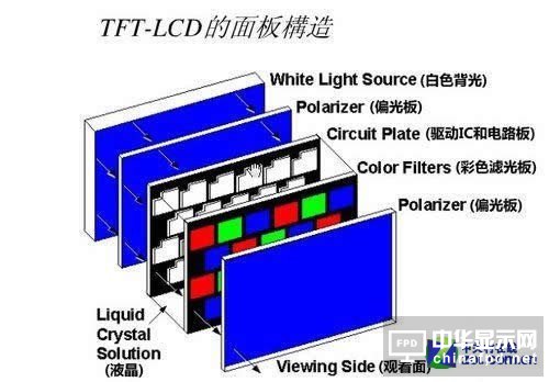 TFT-LCD面板可視為兩片玻璃基板中間夾著一層液晶,上層的玻璃基板是與彩色濾光片結(jié)合,而下層的玻璃則有電晶體鑲嵌于上。 當電流通過電晶體產(chǎn)生電場變化,造成液晶分子偏轉(zhuǎn),借以改變光線的偏極性,再利用偏光片決定畫素(Pixel)的明暗狀態(tài)。