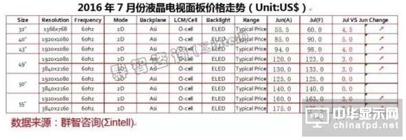 根據群智咨詢(Ʃintell)預測數據顯示,2016年三季度全球液晶電視面板市場呈現明顯缺貨,液晶電視面板的價格迎來全面上漲(個別尺寸除外),其中,32”~43”尺寸段的面板價格呈加速上漲趨勢。