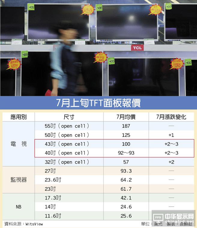 7月面板持續大漲,面板廠針對40吋/43吋等級面板喊出調漲5美元的聲音,預期43吋面板本月可望重回百美元大關。WitsView指出,面板報價可望一路漲到9月,整個第3季40吋/43吋面板有機會大漲10%~15%,面板廠營運將可望重返獲利軌道。