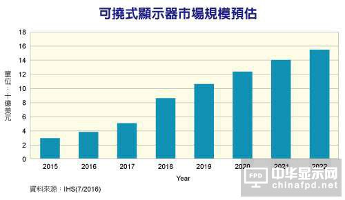 市場研究機構IHS最新預估,到2022年時,可撓式顯示器的產值規(guī)模將上看155億美元,與2016年的37億美元相比,成長幅度高達300%。其中,穿戴式裝置與行動裝置為帶動可撓式顯示器需求成長的兩大引擎。