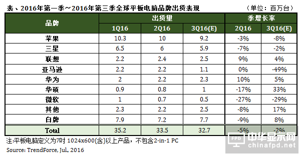 TrendForce最新平板電腦出貨報(bào)告顯示,2016年第二季全球平板電腦出貨3354萬臺,季衰退4.8%,與去年同期相比則衰退8.8%。