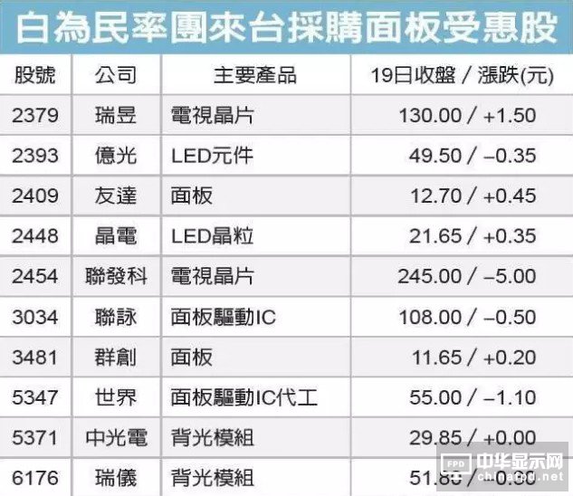 白為民此行,相關供應鏈包括友達、群創等面板廠、電視數位晶片廠聯發科、驅動IC業者聯詠、供應LED模組的億光、晶電等可望雨露均沾。