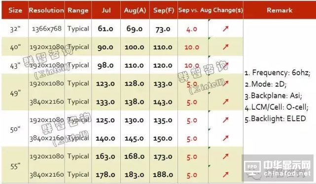 4、55英寸方面,8月55英寸面板均價上漲5美金,預計9月在需求的帶動下繼續上漲,漲幅約為5美金。