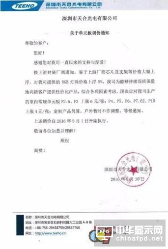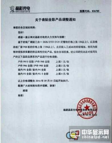 8月30日,晶彩光電貼出“關于表貼全彩產品調整通知”,表示由于燈管、PCB板等原材料價格的上調以及人工成本的增加,晶彩部分表貼全彩價格上漲。