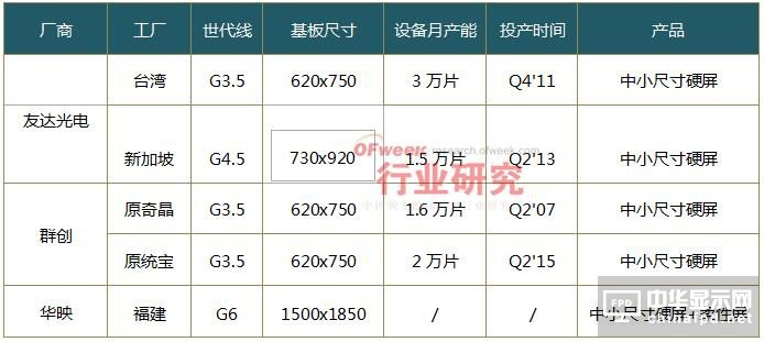 自2005年起到2014年,臺灣面板及其零組件業經歷了長達10年的黃金發展周期。但近兩年起,隨著大陸本土面板廠產能逐漸開出,價格競爭優勢明顯,臺灣面板產業在這一輪競爭中顯得有些力不從心,尤其在新型OLED面板技術投資與新廠擴建上,已遠遠落后于中國大陸及韓國同行廠商。這從以下臺灣面板廠商OLED生產線的狀況可以看出,目前臺灣OLED產能均來自于多年前的舊工廠,其在實際產能和相關配備上比較受限,產品應用上主要為利基型小尺寸可穿戴設備。