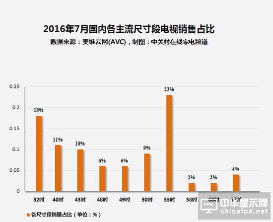 現在電視市場中,各尺寸段電視都可以在賣場或者電商購物網站中找到,小到32英寸這樣的入門級尺寸,大至60英寸甚至是70英寸電視都有。那么,哪一尺寸段的電視銷售占比最高,成為用戶最青睞的產品呢?大數據顯示,32英寸電視,銷售份額占比為18%;40英寸電視,銷售份額占比為11%,43英寸電視,銷售占比為10%;48英寸電視,銷售占比為6%;49英寸電視,銷售占比為6%;50英寸電視,銷售占比為9%;55英寸電視,銷售占比為23%;58英寸電視,銷售占比為2%;60英寸電視,銷售占比為2%,65英寸電視,銷售占比為4%。