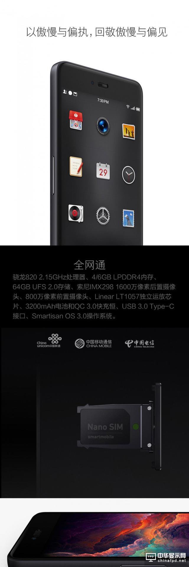 除此之外,該網站還放了錘子T3的配置介紹:搭載高通驍龍820 2.15GHz處理器、4/6GB LPDDR4內存、64GB UFS 2.0存儲、后置2100萬像素、前置800萬像素攝像頭、3200mAh電池支持QC3.0快充、USB采用的是Type-c接口、搭載最新的Smartisan OS 3.0操作系統。
