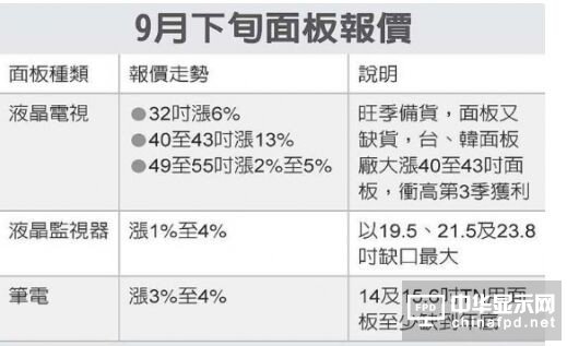 IHS顯示器研究總經理謝勤益表示,第3季正好是電視備貨旺季,加上面板缺貨嚴重,且年底旺季促銷將要來臨,促使面板廠展開大幅漲價動作,尤其大陸面板廠在8月大漲32吋面板10美元,創下32吋史上最大漲幅,其他電視面板尺寸受此激勵,也紛紛在9月下旬展開大幅漲價動作。