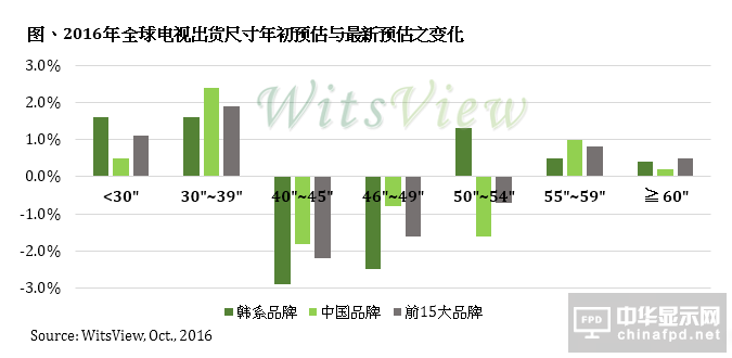 WitsView預估2016年全球前十五大電視品牌40~49寸出貨比重較年初預估值下滑3.8%,為出貨尺寸變化最為劇烈的區(qū)段,在中尺寸面板供給受限下,品牌廠紛紛轉往更大或更小兩端尺寸的面板,使得30~39寸與55~59寸的出貨比重成長1.9%與0.8%。