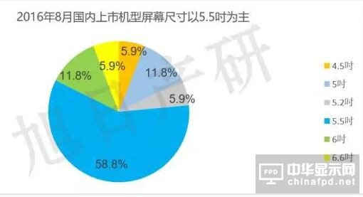 據統計,2016年8月國內共發布17款機型,屏幕尺寸分布在4.5-6.6之間,其中5.5寸有10款,占比高達58.8%;5、6寸分別只有兩款,占比為11.8%;剩下3款分別為4.5、5.2、6.6寸。根據旭日產研近幾個月的跟蹤報告顯示,5.5寸已經成為市場主流手機尺寸,預計還將統治手機尺寸很長一段時間。