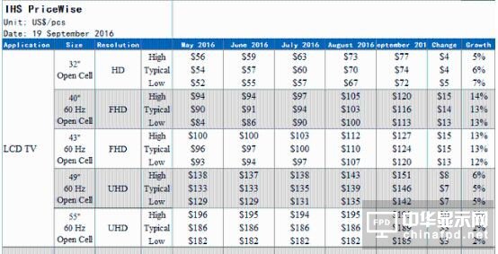 本次IHS公布的國際市場面板價格更新于2016年9月19日,數(shù)據(jù)顯示,32英寸720P高清液晶電視面板,最高漲幅為5美元,最高報價為77美元。1080P全高清面板方面,40英寸全高清面板,最高漲幅達(dá)到了15美元,最高報價為120美元。43英寸1080P全高清液晶面板,最高漲幅同樣為15美元,最高報價為127美元。