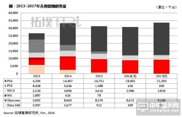 在各廠都面對供應(yīng)不足的困境中,11 月開始將銷售 PS4 Pro 的 Sony 依舊會是 VR 競爭中最大的贏家。在添加 VR、HDR 功能特色及主機改版的吸引力下,Sony 今年游戲機的銷售量將沖上高點,拓墣預(yù)估 2016 年 PS4 整體銷售量將會達到 1,840 萬臺,并且 2017 年將成長 15.2%,達 2,120 萬臺。