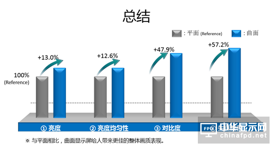 曲面屏在業界看來,其相對于平面屏而言,有幾個天生的血統優勢,其一是顯示效果。根據國家數字音視頻及多媒體產品質量監督檢驗中心系列測試內容顯示,相比于平面屏而言,曲面屏的亮度平均提升13%,亮度均勻性平均提升12.6%,對比度平均提升47.9%、失真改善率平均提升57.2%,從顯示效果上來說,曲面屏的效果優于平面屏。